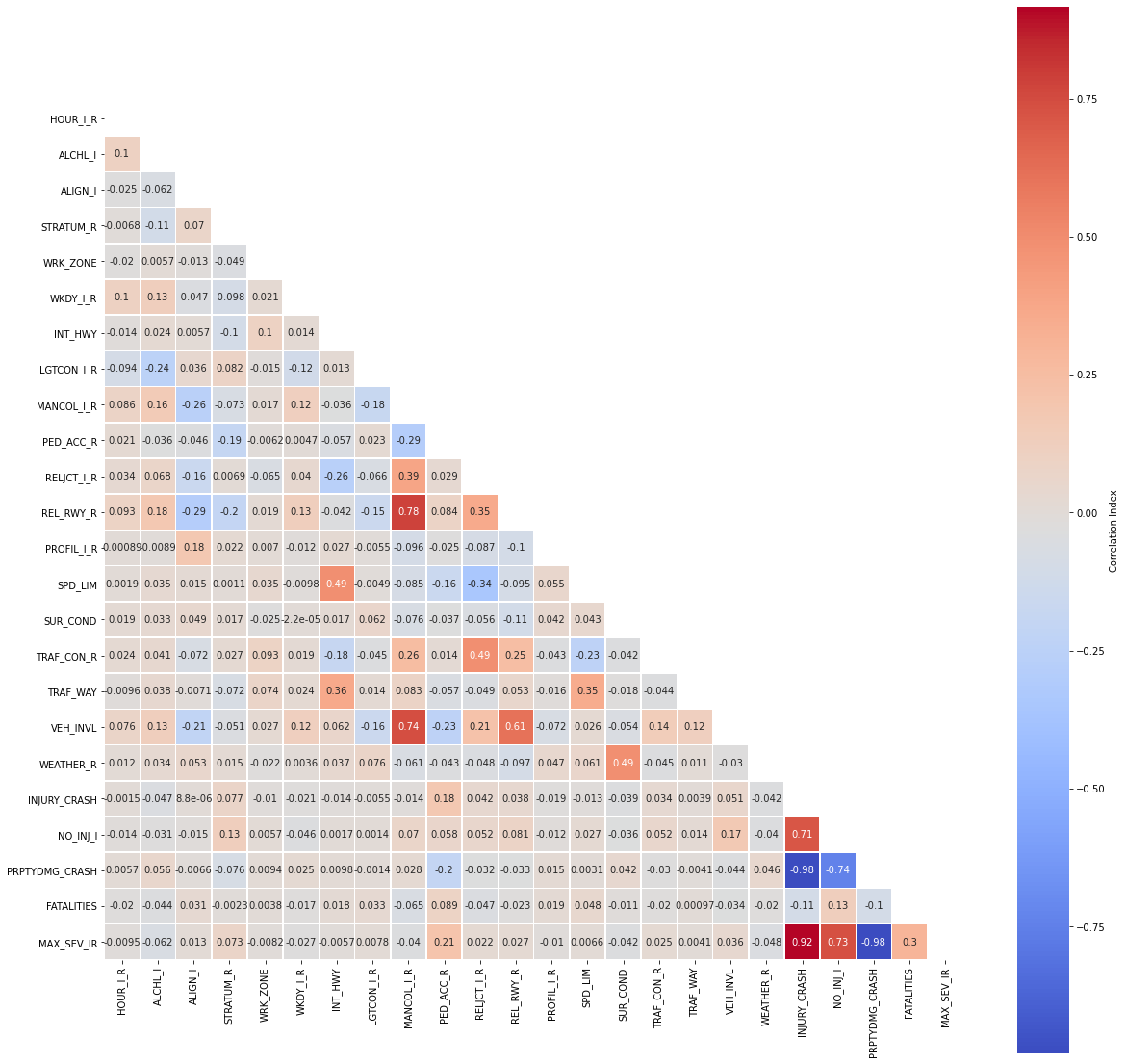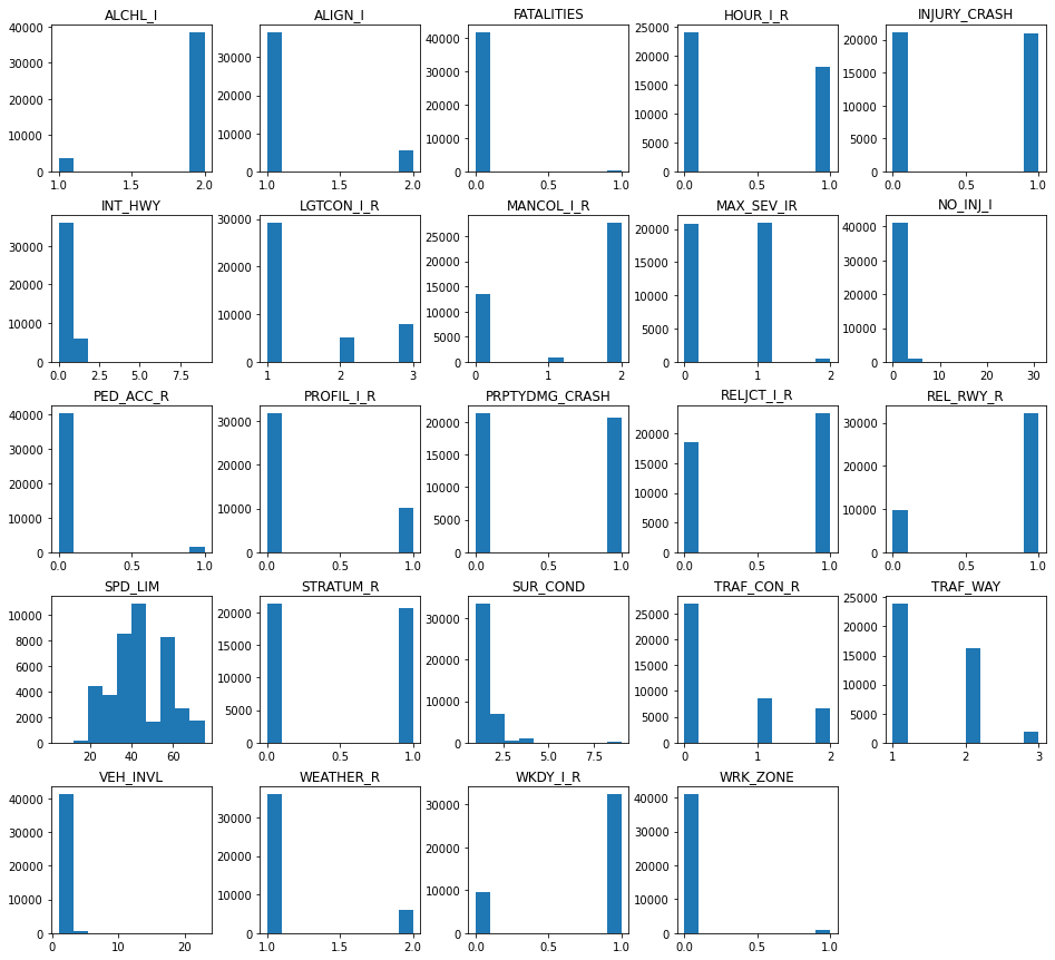 A little more than half of the accidents resulted in injuries; thus, we should intrinsically focus our predictions in favor of injuries. However, predictive analytics requires more than merely a cursory glance at first tier probability results. Therefore, we cannot make any assumptions at face value. We will proceed to model this behavior later, but for now let us continue exploring the data.