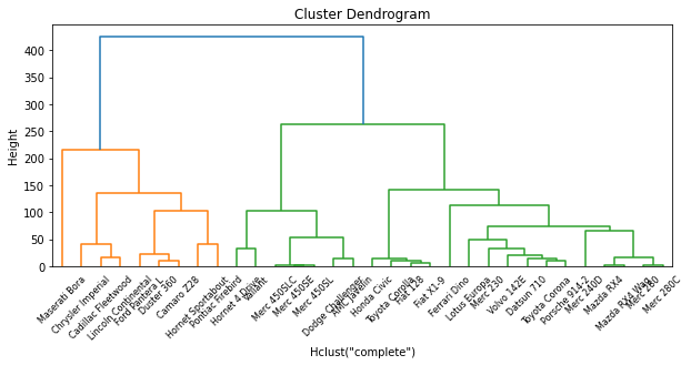 plt.title("Cluster Dendrogram"); plt.xlabel('Hclust("complete")')